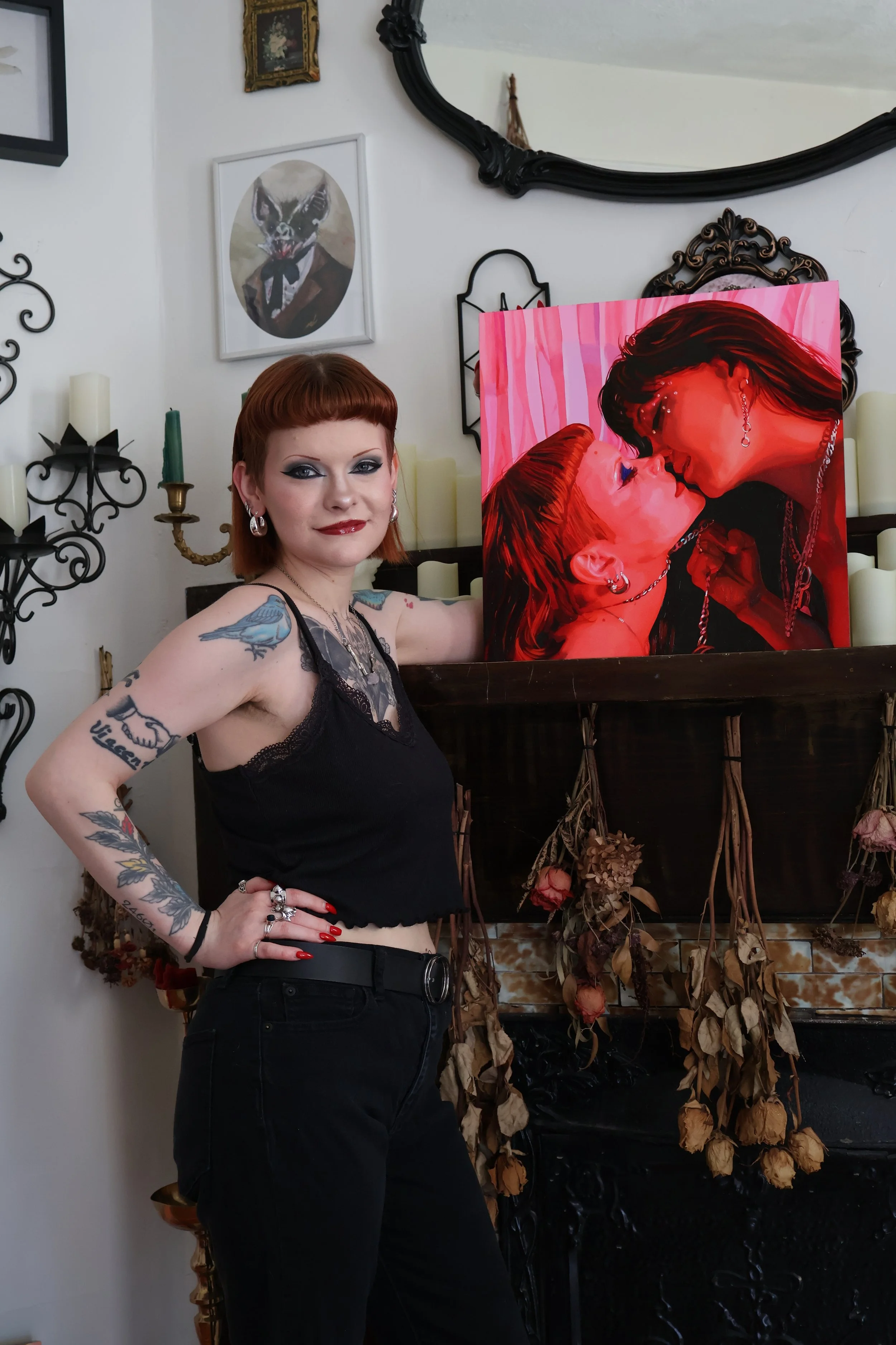 Her recent body of work expands her long-standing focus on the female figure to include explorations of kink, femme identity, and sexuality through the lens of the female gaze. Drawing on both the lived experiences of her models and her own perspective as a pansexual woman, Sterling’s paintings confront the historical and ongoing erasure of gender fluidity and queer desire within Western visual culture. By reclaiming the language of legal pornography and erotica, her work challenges patriarchal narratives and offers a space where femme and queer identities are centered, empowered, and redefined.