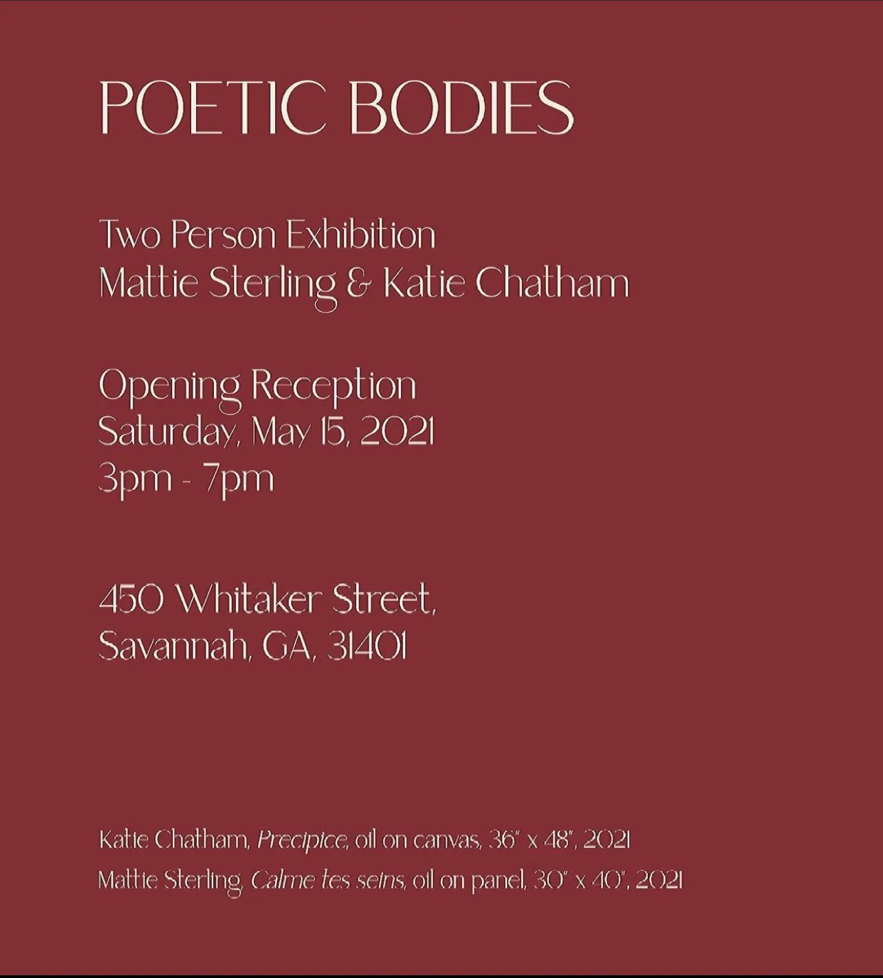 POETIC BODIES explores the sacredness and power of the human figure within two different frameworks. Both artists work with the human form and exploration of the human experience. Their work is a reminder of the authority and freedom that we have within our own lives. Chatham pulls from narratives across cultures that relay stories of human fortitude and transfiguration. Focusing on the Hero’s Journey, she depicts instances of metamorphosis with dramatic imagery of the human figure in oil on canvas. Using traditional methods of oil on panel, Sterling’s work is a manifestation of feminine figures as well as a feminist assessment of conceptions behind women’s sexuality and sexual identity.